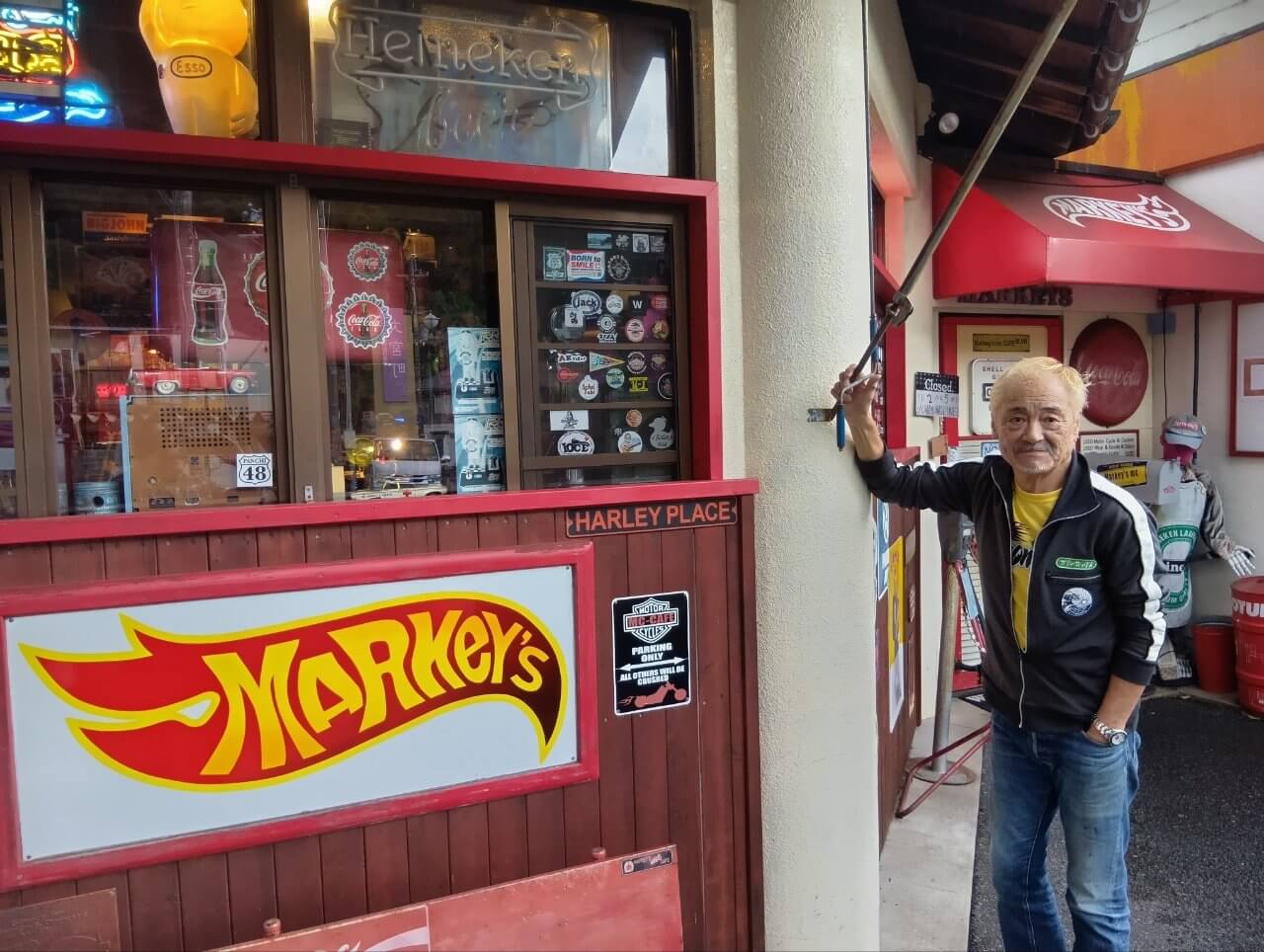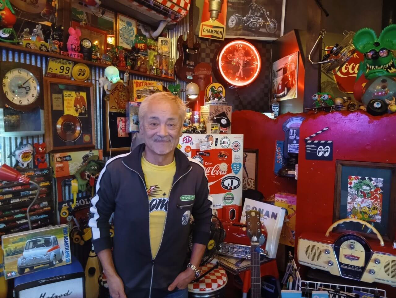 The shop is located in a hexagonal building adjacent to Kyotango-Omiya Station (Omiya-cho, Kyotango City) on the Kyoto Tango Railway. Entering the shop is like stepping into an overturned toy box. The ceiling and walls are densely decorated with Elvis Presley memorabilia, goods from the movies “American Graffiti” and “Grease”, portable radios, large boomboxes, miniature cars, and 1950s American memorabilia.