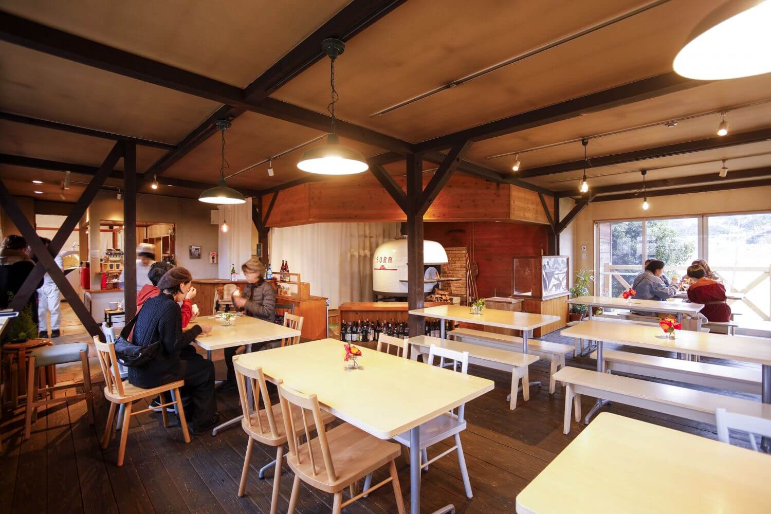 Wood-fired pizza is served in the restaurant on weekends and holidays.